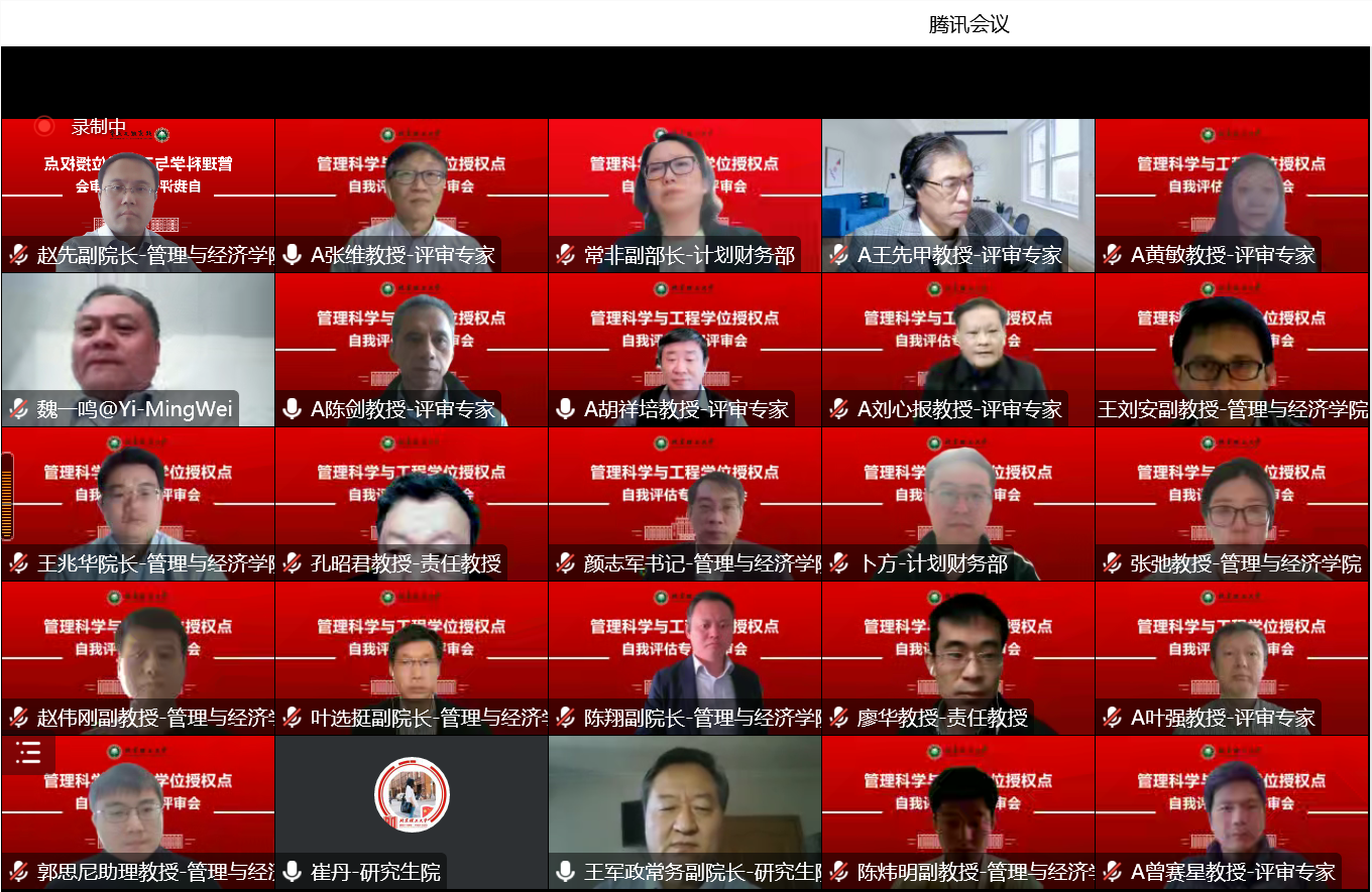 On November 30, the self-evaluation expert review meeting of the management Science and Engineering discipline of Beijing Institute of Technology was held online. Party committee standing committee, vice President professor Wei Yiming attended the meeting and gave a speech. Reviewing experts were invited from Tsinghua university, Tianjin university, Wuhan university, Dalian university of technology, Shanghai jiaotong university, Harbin university of technology, Hefei university of technology, China university of science and technology, Northeastern university and other institutes with strong management science and engineering disciplines. Leaders of graduate School, Planning and Finance Department, leaders of School of Management and Economics, professors of management science and Engineering, and representatives of young teachers attended the meeting.