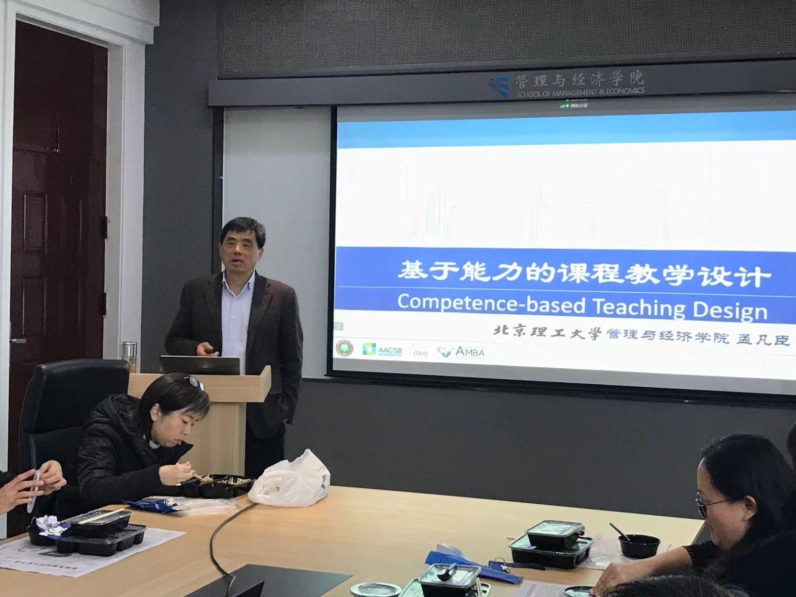 The lecturer is Meng Fanchen, Beijing famous teacher, professor and doctoral supervisor of the School of Management and Economics of Beijing Institute of Technology.Professor Meng Fancheng has many years of experience in teaching management and professional construction, international certification and long-term front-line teaching. Professor Meng Fanchen exchanged his personal experience in talent training and classroom teaching design with the title of" Ability-based curriculum teaching design ".More than 30 teachers from the School of Management and Economics participated in the report online and offline simultaneously.