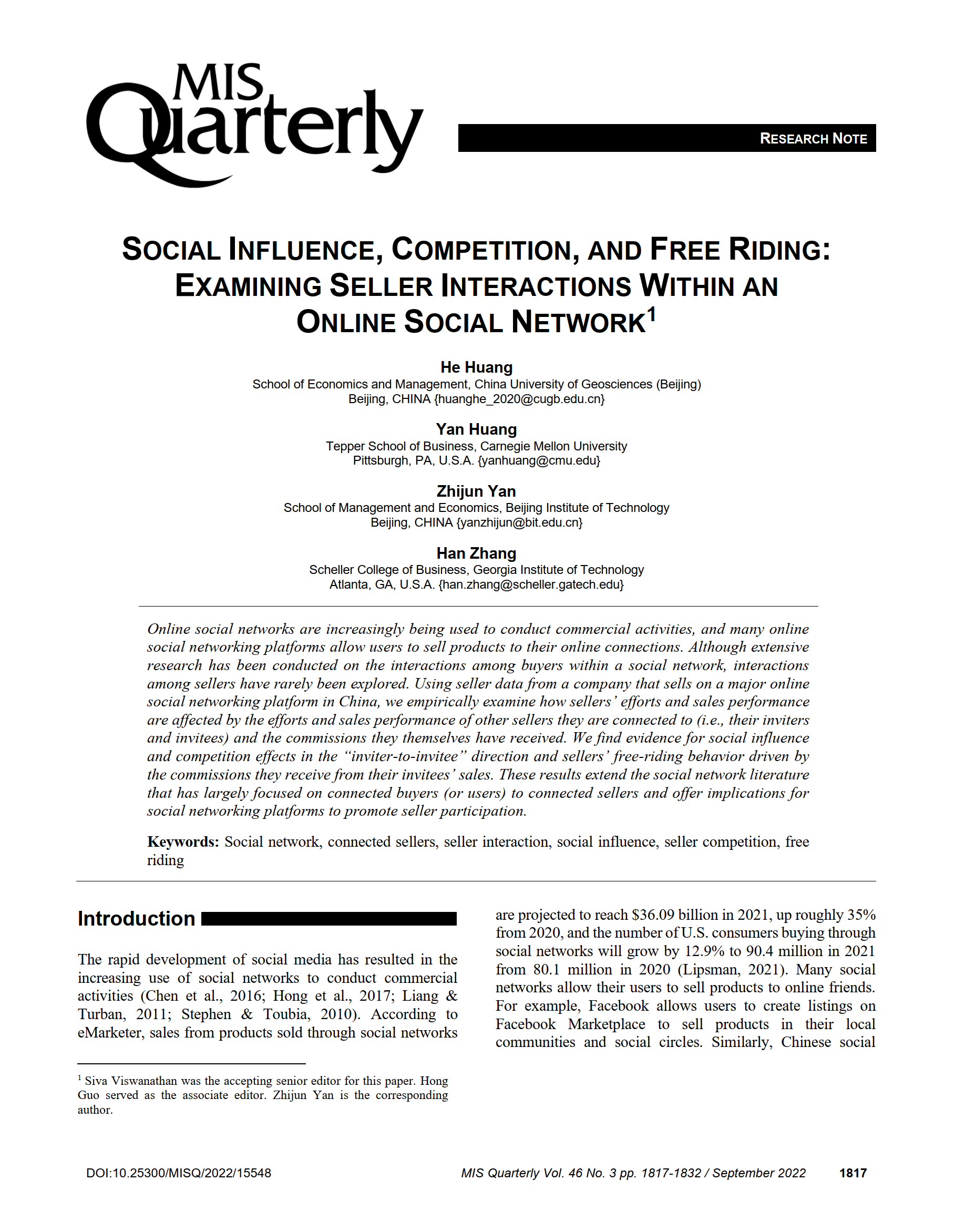 Recently, Professor Yan Zhijun and Dr. Huang He from the Department of Management Engineering, in collaboration with Professor Huang Yan from Carnegie Mellon University and Professor Zhang Han of Georgia Tech University, published a research paper in MIS Quarterly with the title of " Social Influence, Competition, and Free Riding: Examining Seller Interactions Within an Online Social Network " .