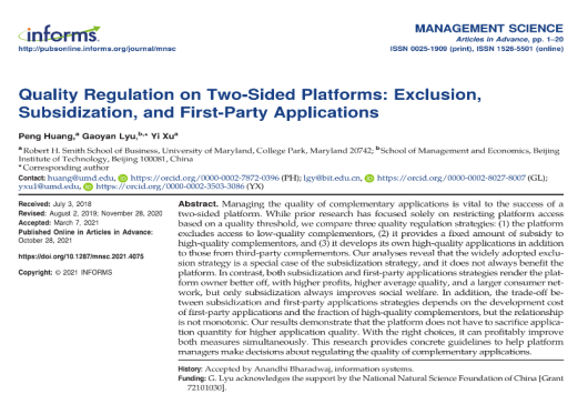 Recently, Professor Lv Gaoyan, a teacher of the Department of Management Science and Logistics of our school, and Professor Yi Xu, a collaborator of the University of Maryland, published a research paper titled "Quality Regulation on Two-Sided platforms: Exclusion, Subsidization, and First-Party Applications" in Management Science, a UTD journal of management.