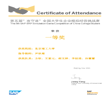 On November 20,2021, the 5th SAP ERP Simulation Game Competition of China College Student officially concluded after experiencing the simulation competition, preliminary competition and final competition. Many domestic universities, including Tsinghua University and the Central University of Finance and Economics, have signed up for the competition.The team of Beijing Institute of Technology (Fang Qin, Wang Ziyuan, Hao Wenting, Li Jiaolian and Sun Huihui), led by teacher Yin Qiuju, stood out from many university teams, won the first place, and won the only first prize in the challenge. Beijing Institute of Technology will also represent Chinese universities in the 14th Global SAP ERPsim Finals held in 2022.