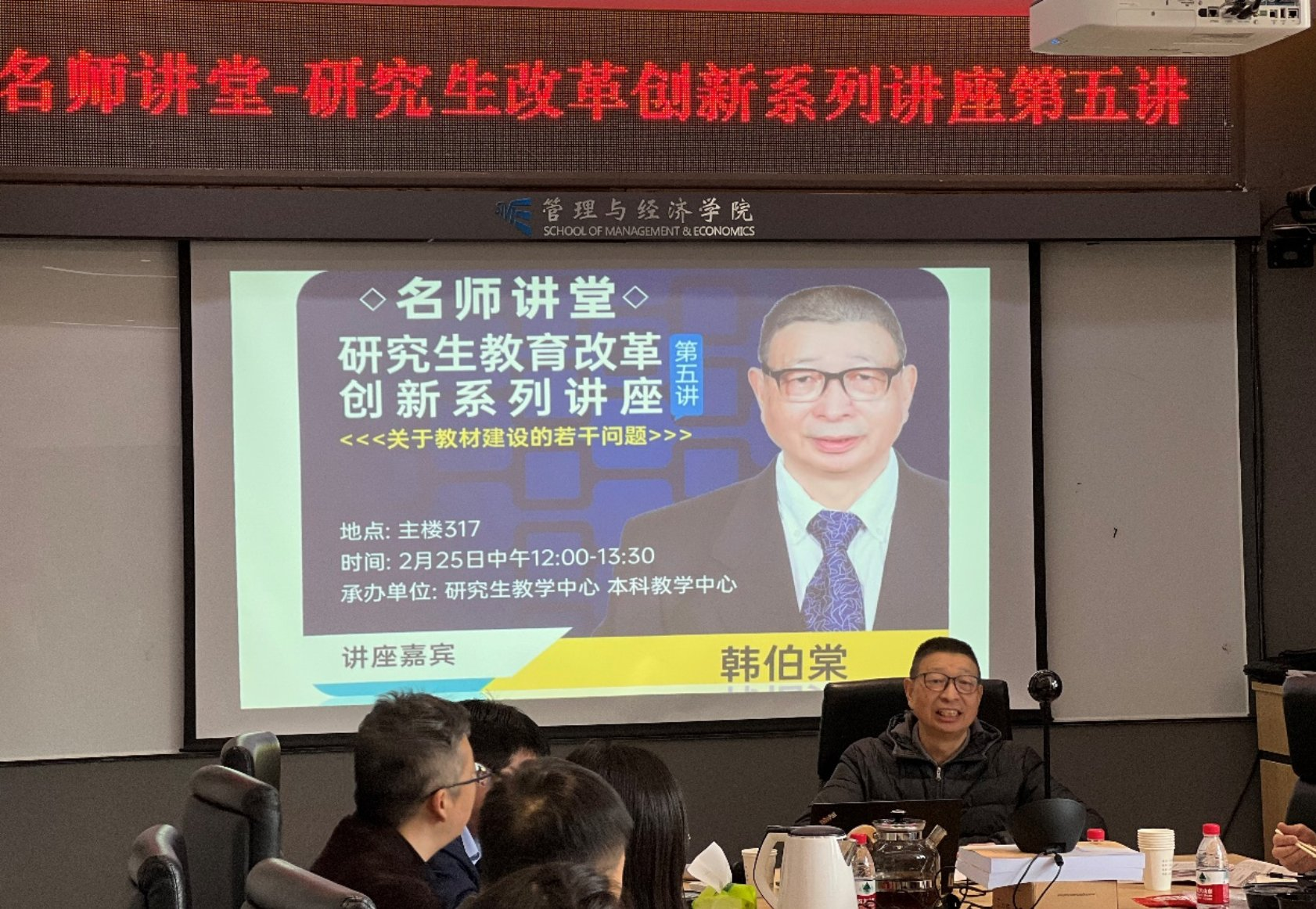 On February 25,2022, the fifth lecture of "Master Teacher Lecture-Graduate Education Reform and Innovation Lecture Series" was held in the 317 of the main building.Professor Han Botang, a professor and doctoral supervisor of the School of Management and Economics and a national master teacher, was invited to give a teaching lecture entitled "Several issues on the construction of teaching materials". Dean Wang Zhaohua, Secretary Yan Zhijun, Vice Dean Zhang Xiang, Zhao Xian and more than 40 teachers attended the lecture online and offline.The lecture was hosted by Associate Professor Deng Jianwei.