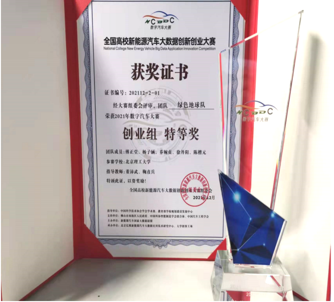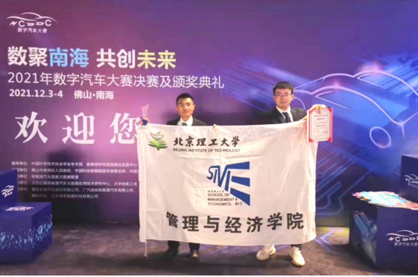 On December 4,2021, the final of the 2021 National University New Energy Vehicle Big Data Innovation and Entrepreneurship Competition (referred to as: Digital Automobile Competition) was held in Qiandeng Lake Venture Capital Town, Foshan City, Guangdong Province.Beijing Institute of Technology has three teams entering the national final, including the team from the School of Management and Economics: Fu Zhengtang, Yang Zihan, Qiao Wanzhen, Xu Danyang, Chen Kaiyuan. This five students team —— Green Earth Team won the national grand prize, teacher Dong Peiwu and professor Ju Yanbing won the competition excellent instructor award.The award has created the historical award record of the School of Management and Economics of Beijing Institute of Technology in the competition, which is of great significance to the discipline innovation, development and evaluation of the School and the inspection of discipline construction results.