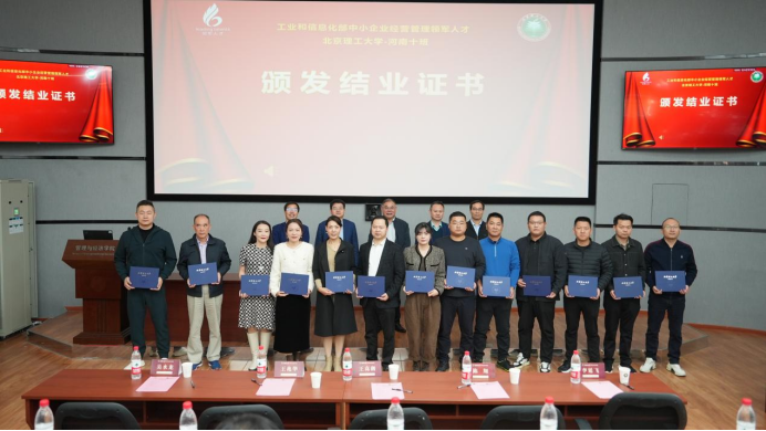 On November 3rd, 2023, the closing ceremony of Henan Class 10 for the Ministry of Industry and Information Technology, leading talents in the operation and management of small and medium-sized enterprises was held in Classroom 241 of the main building of our University. Wang Gaogao, second-level inspector of Henan Provincial Department of Industry and Information Technology, Li Yanfei, second-level director member, Wang Zhaohua, dean of the School of Management and Economics of Beijing Institute of Technology, Chen Xiang, vice dean, Wu Shuilong, assistant dean and director of Professional Degree Center, and entrepreneurs from Henan Class 10 attended the graduation ceremony.
