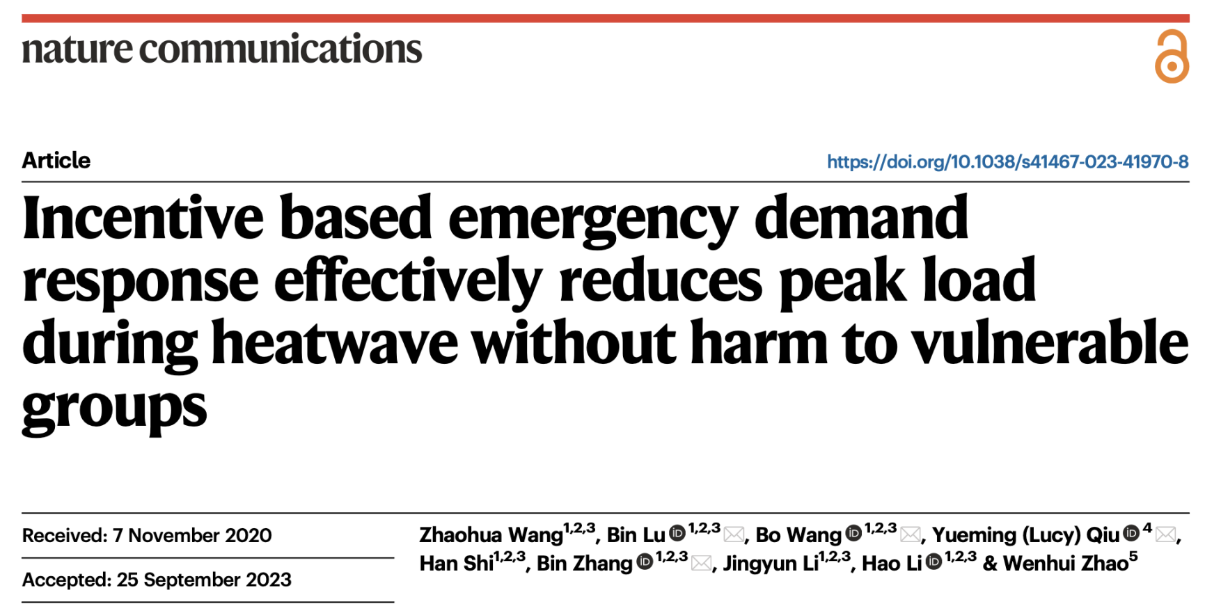 Zhaohua Wang, BinLu*, Bo Wang *,Yueming (Lucy) Qiu*,Han Shi, Bin Zhang*, Jingyun Li, Hao Li, Wenhui Zhao.Incentive based emergency demand response effectively reduces peak load during heatwave without harm to vulnerable groups.Nature Communications (2023).