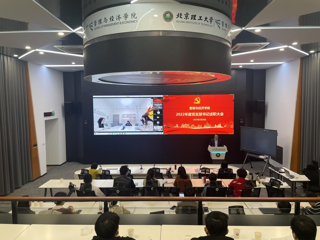 The Party Committee of the School of Management and Economics conscientiously studied and implemented the Spirit of the 20th Party Congress and the spirit of the 13th Beijing CPC Party Congress, and implemented the requirements of comprehensively governing the Party with strict disciplines. On February 28, the on-site report meeting of the grassroots Party branch secretaries on party building was held, and the meeting was conducted by video link between the two campuses. Members of the Party Committee, teachers' representatives, and all the party branch secretaries attended the meeting. The meeting was presided over by Peng Mingxue, deputy secretary and vice dean.