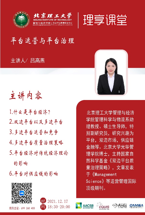 2021年12月17日,管理与经济学院助理教授吕高燕应邀做了题为“平台运营与平台治理”的线上讲座。吕高燕老师博士毕业于北京大学光华管理学院,现为管理与经济学院管理科学与物流系助理教授,硕士生导师。吕老师的研究兴趣为平台、双边市场、供应链金融等,主持国家自然科学基金项目“双边平台质量治理策略”,研究成果发表在《Management Science》等运营管理国际顶级期刊。