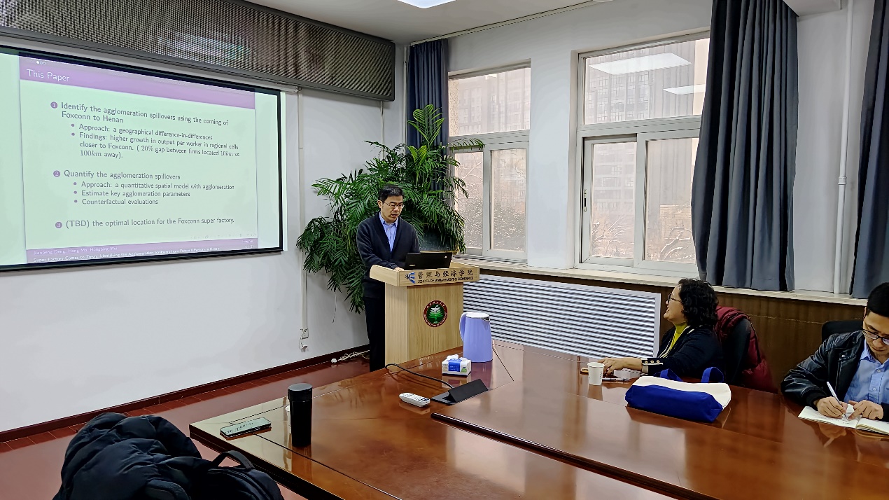 2023年12月13日上午,清华大学经济管理学院教授,经济系副主任马弘教授应邀做题为“SuperFactoryComes to Town: Identifying the Agglomeration Spillovers from Foxconn Factory in Henan”的学术报告。报告由我院应用经济系赵玉焕教授主持,吸引了学院众多师生积极参与。