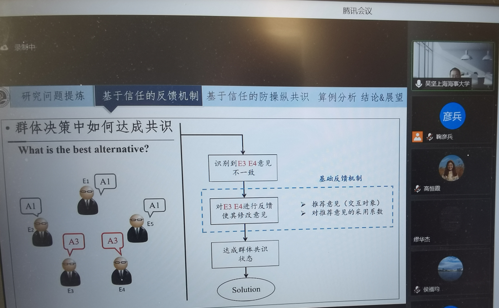 12月14日上午,【明理讲堂2021年第66期】有幸邀请到上海海事大学经济管理学院吴坚教授带来题为“基于社会网络信任的群体共识决策”的学术报告。北京成品人和一品二品的区别管理与经济学院管理工程系鞠彦兵教授主持报告。受疫情影响,本次报告会以线上的形式开展,管理与经济学院部分教师、研究生参加了本次报告会。