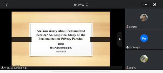 1月6日,【明理讲堂2021年第3期】有幸邀请到台湾辅仁大学Yi-Cheng Ku教授为大家带来题为“Are You Worried About Personalized Service? An Empirical Study of the Personalization-Privacy Paradox”的学术报告。学院颜志军教授主持会议并对顾老师表示热烈的欢迎。