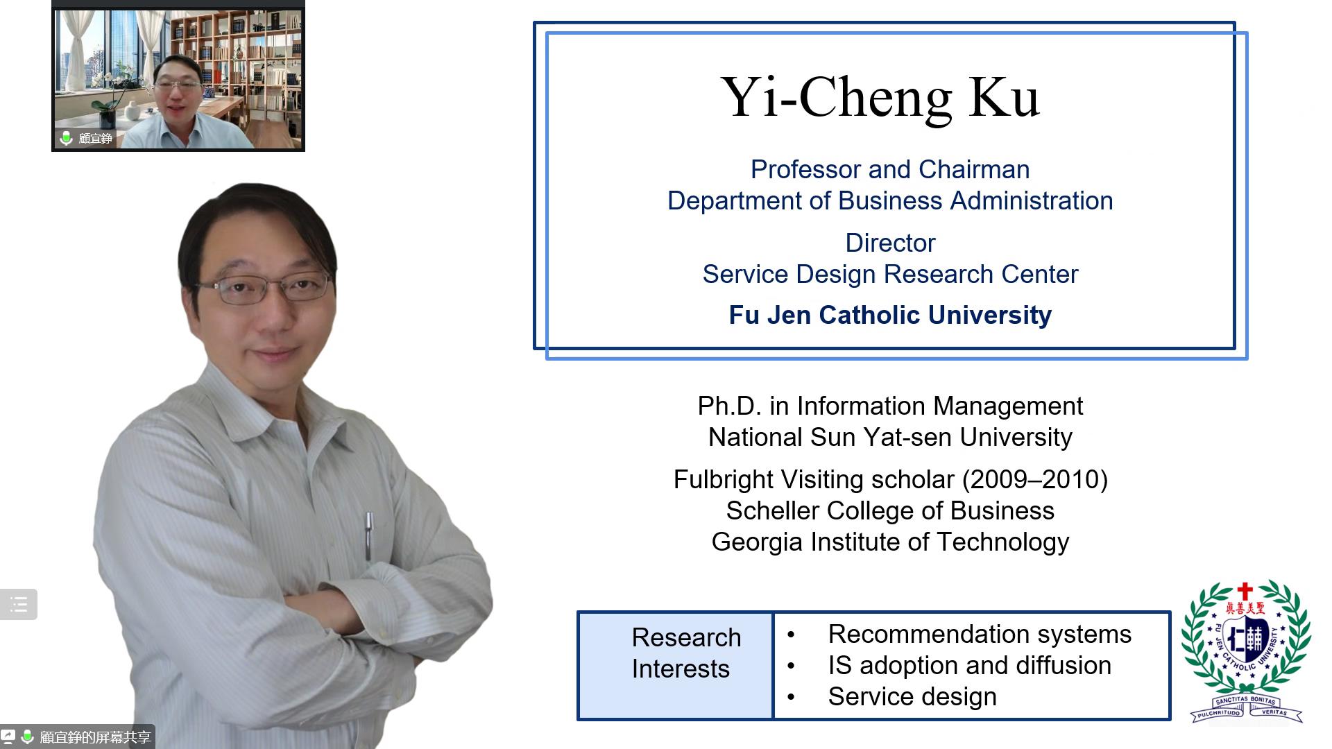 顾宜铮教授,台湾辅仁大学工商管理系主任,服务设计研究中心主任。2009-2010年获台湾中山大学信息管理博士学位。他是佐治亚理工学院谢勒商学院富布赖特访问学者。他的研究兴趣包括推荐系统、信息系统的采用和传播以及服务设计。曾在《Journal of Management Information Systems》、《Decision Support Systems》、《Information & Management》、《Computers in Human Behavior》、《International Journal of Medical Informatics》、《Journal of Electronic Commerce Research》等学术期刊上发表文章。