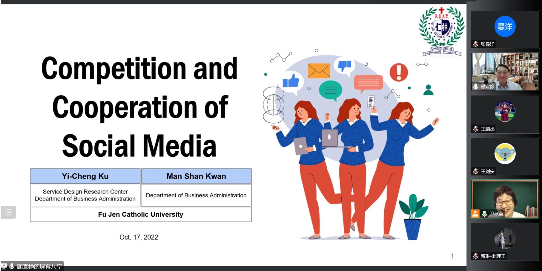 应管理与经济学院的邀请,台湾辅仁大学工商管理系顾宜铮教授于2022年10月17日上午10点在线上作了题为“Competition and Cooperation of Social Media”的学术报告。报告会由尹秋菊副教授主持,学院众多师生参加了报告会。