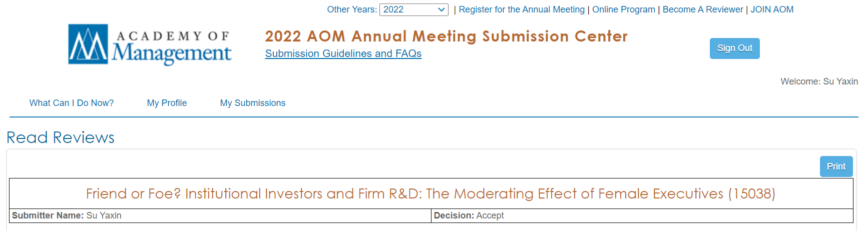 美国管理学会(AOM)成立于1936年,致力于管理科学知识传播,目前在全球拥有19000多名会员,遍布120多个国家,是世界上最大、历史最悠久的权威学术组织。其出版的Academy of Management Journal (AMJ)、Academy of Management Review (AMR) 和Journal of Organizational Behavior等多个期刊也是国际公认的管理学领域权威期刊。年会是管理学会的核心活动,每年将会有来自世界各地近万名学者参加会议,影响深远。美国管理学会年会(Annual Conference of Academy of Management)是国际高水平管理学会议之一。
