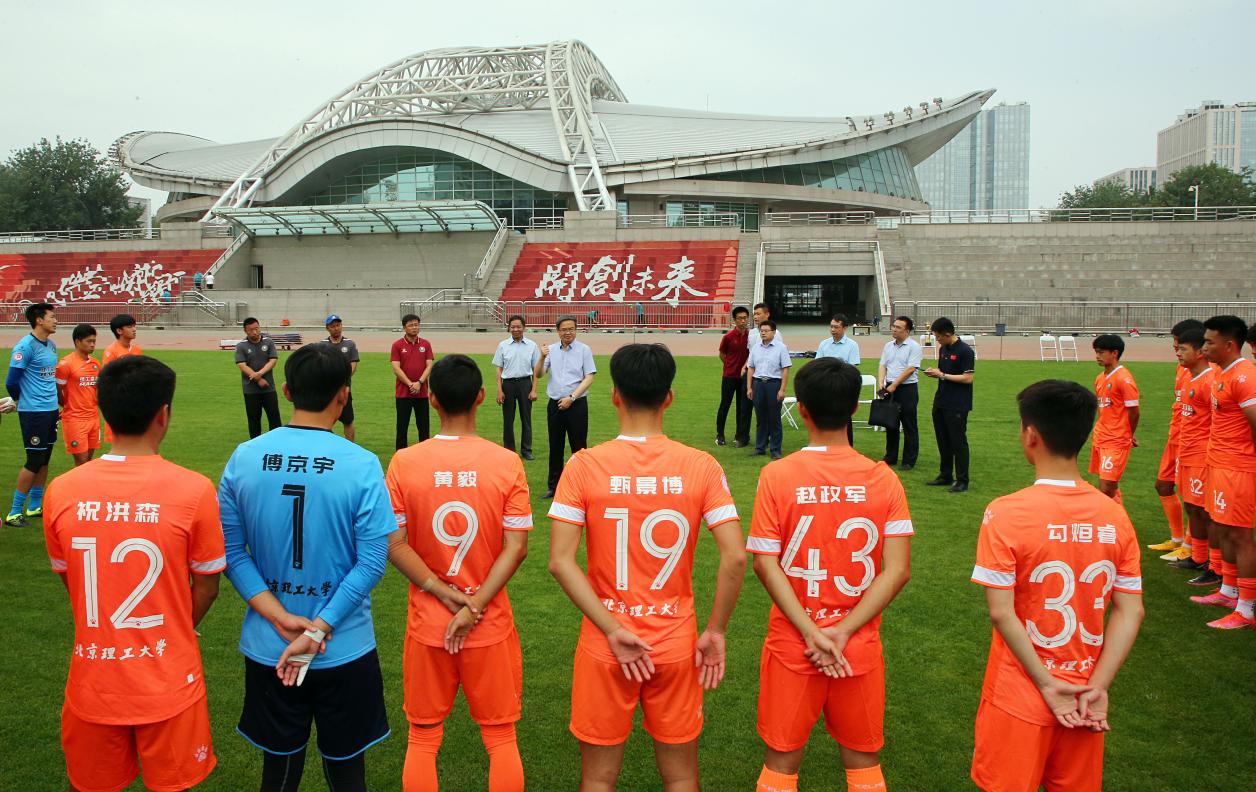 校长张军了解了足球队获得全国大学生足球联赛第十一冠的基本情况,同时询问比赛训练过程中的需求及困难,并向全体运动员、教练成员做出征动员讲话。