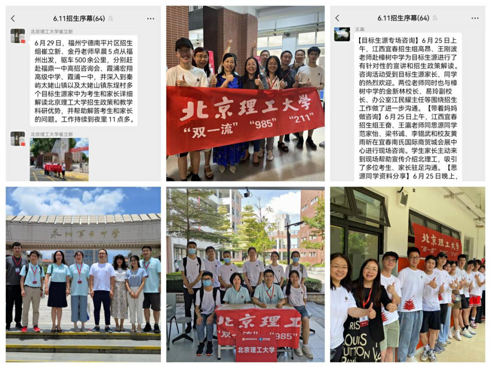 福建招生组各地区领航老师们精准施策,勠力同心,先后与屏东中学、长乐一中、宁德一中、福清一中、福州三中、福清一中、连江一中、福师大附中、福鼎一中等重点中学达成优秀生源推荐、线下宣讲等合作意向。针对今年在闵招生形势,招生组采取“线上宣讲+线下活动+走访中学+媒体宣传+每日复盘”的工作方式,全面出击,力争突破。期间,思源团队、校友招生大使齐上阵,积极调动高中校领导、班主任教师及学生家长,就我校的发展历史、办学特色、办学实力、学习环境、专业设置、各专项计划的招生情况等问题与考生和家长面对面交流,为考生及家长填报志愿提供了合理的建议和意见,促成了广大福建考生对北理工的进一步了解;招生组还通过福州日报和海峡教育报联合举办的直播宣传节目等官方媒体做直播现场宣讲,进一步扩大北理声音!福建招生组针对有潜力的考生耐心、细致地进行逐一分析,并与实验班班主任进一步沟通锁定目标生源,为北理2022年在福建招生工作奠定了坚实有力的北理力量!