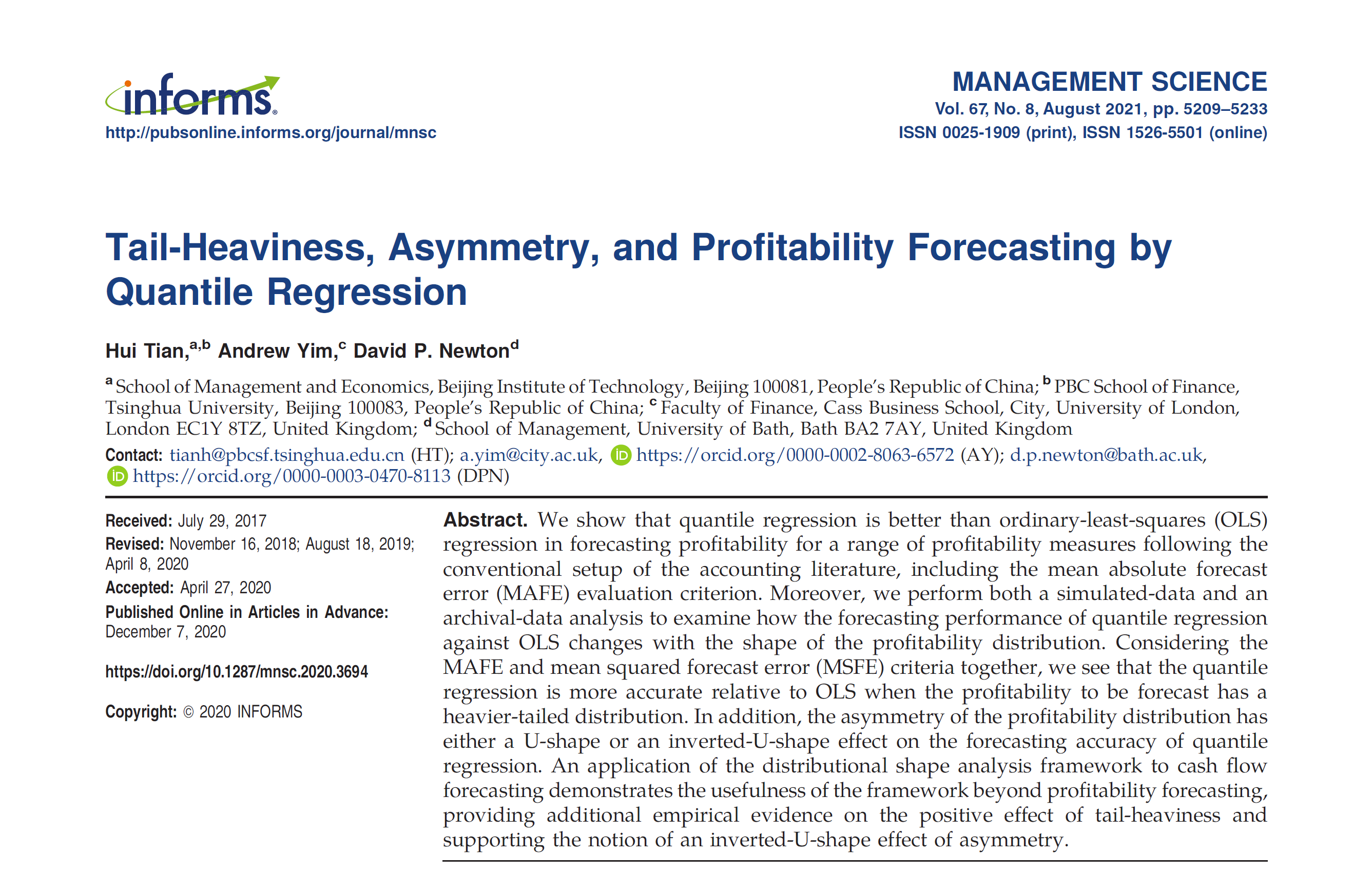 近日,我院会计系田晖老师与英国卡斯商学院合作者Andrew Yim教授及英国巴斯大学David Newton教授在管理学顶级期刊Management Science发表题为“Tail-Heaviness, Asymmetry, and Profitability Forecastingby Quantile Regression”的研究论文。