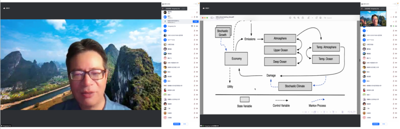 7月5日上午,美国俄亥俄州立大学蔡拥阳教授作了主题为“Integrated Assessment Models and Uncertainty”的特邀讲座,主要讲解了不同综合评估模型中对于不确定性的处理方法。不确定性在气候和经济系统中广泛存在,包括参数不确定性、模型不确定性、气候临界点和经济风险,蔡教授针对综合评估模型中的不确定性问题提供了解决方案。讲座通俗易懂、学术性高,营员们与蔡教授进行了热烈的讨论。