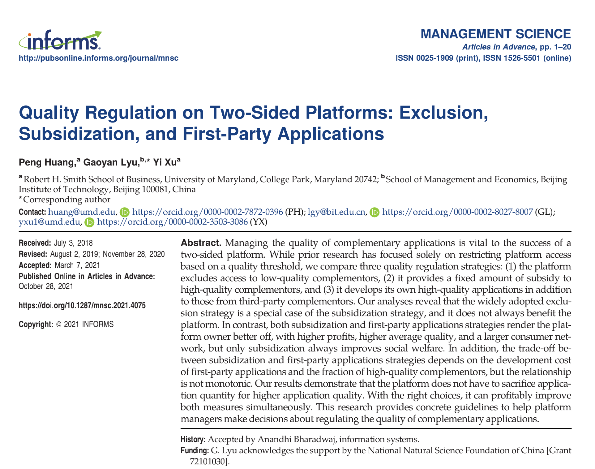 近日,我院管理科学与物流系吕高燕老师与美国马里兰大学的合作者Peng Huang教授,Yi Xu教授在管理学UTD期刊Management Science发表题为“Quality Regulation on Two-Sided platforms: Exclusion, Subsidization, and First-Party Applications”的研究论文。
