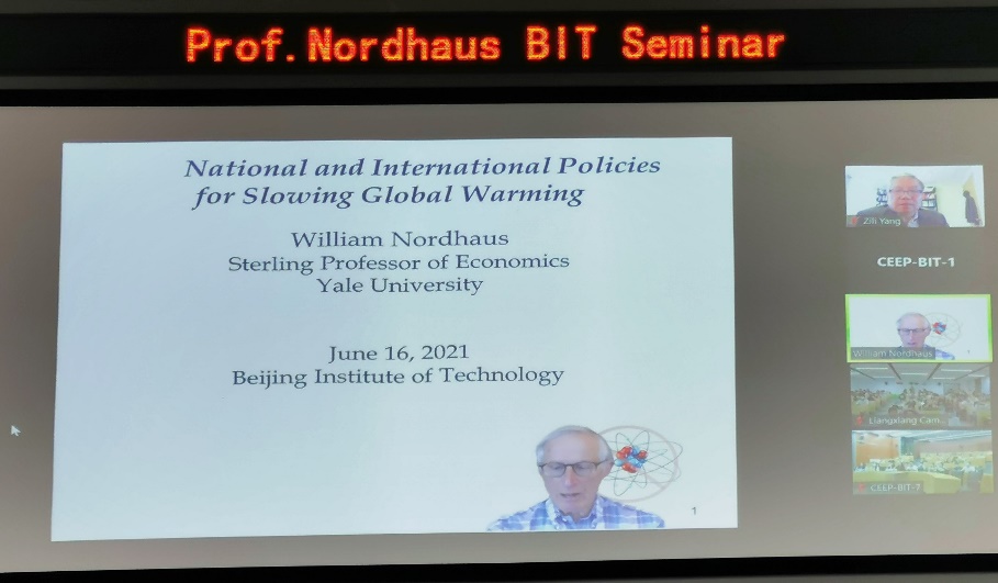 2021年6月16日,诺贝尔经济科学奖获得者威廉·诺德豪斯(William D.Nordhaus)在“北理工百家大讲堂”为师生做了题为“Economic Approaches to Climate Change Policy”的线上学术报告。学校300余名师生在中关村和良乡两个校区参加了报告会。参加报告会的人员还有国家科技部、国家自然科学基金委、中国科学院,学校研究生院、国际交流合作处等部门工作人员以及兼职教授杨自力。报告会由北京成品人和一品二品的区别讲席教授、副校长魏一鸣主持。
