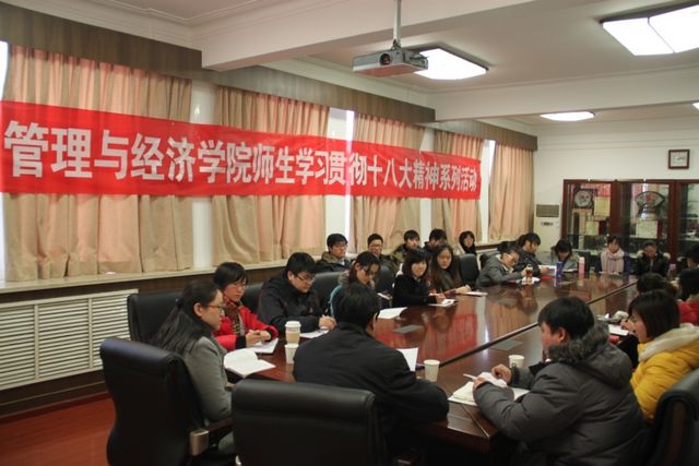 2012年12月6日下午13点,管理与经济学院党团干部集中学习党的十八大会议精神座谈会在主楼317举行。出席此次座谈会的有管理与经济学院党总支书记李金林老师,管理与经济学院副书记、副院长仇芳老师,管理与经济学院分团委书记彭明雪老师,管理与经济学院研工委书记梁昊老师。此外各班党支部书记也参加了此次学习活动。