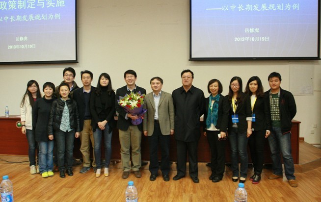 随后,岳处长以国家国民经济和社会发展五年规划为例,分六部分讲解了公共政策的制定和实施。一是对规划的定义、性质、作用等内容进行了简要介绍,二是概述了国家中长期发展规划的历史演进,重点介绍了我国政府规划理念从以物为本到以人为本、从单纯的加快发展到科学发展、从倾斜式重点发展到全面发展、从产业均衡到空间均衡、从注重经济效率到生态效率、从国内均衡到全球视野、从促进增长到管理增长的转变。三是介绍了由总体规划、主体功能区规划、专项规划、区域规划、年度计划构成的规划体系。四是介绍了规划编制程序。五是介绍了规划的主要内容,即指导方针、发展目标、战略任务、政策措施、实施机制、发展环境等。六是介绍了规划的具体实施。最后,岳处长还专门对国家中长期规划进行了学术上的更深层次的分析与探讨,分析我国目前发展规划的优势和劣势,并提出了改进的建议。岳处长选取的案例真实生动,实用性强,理论讲解深入浅出,让全体学生对我国的中长期发展规划体系有了完整的认识,获得了书本上无法学到的宝贵知识。