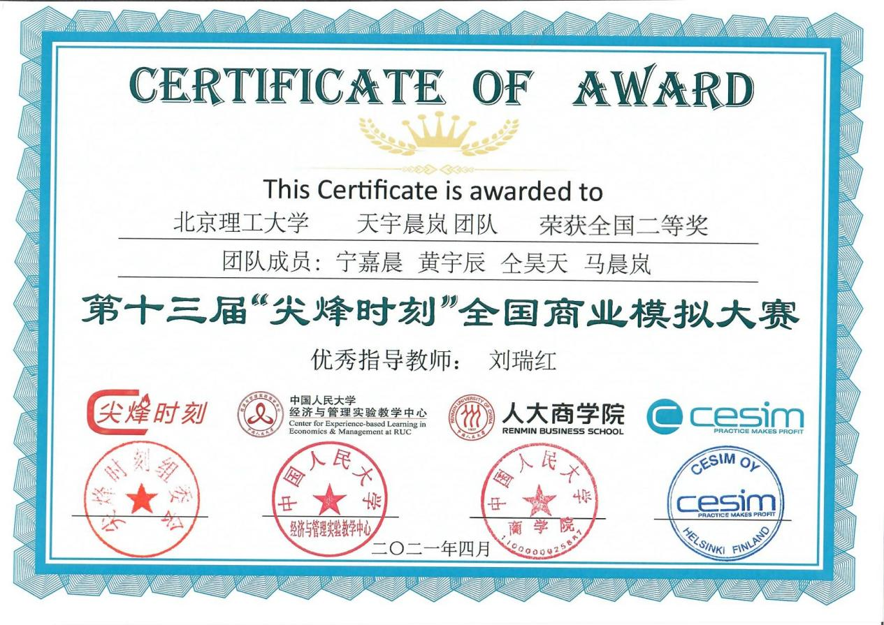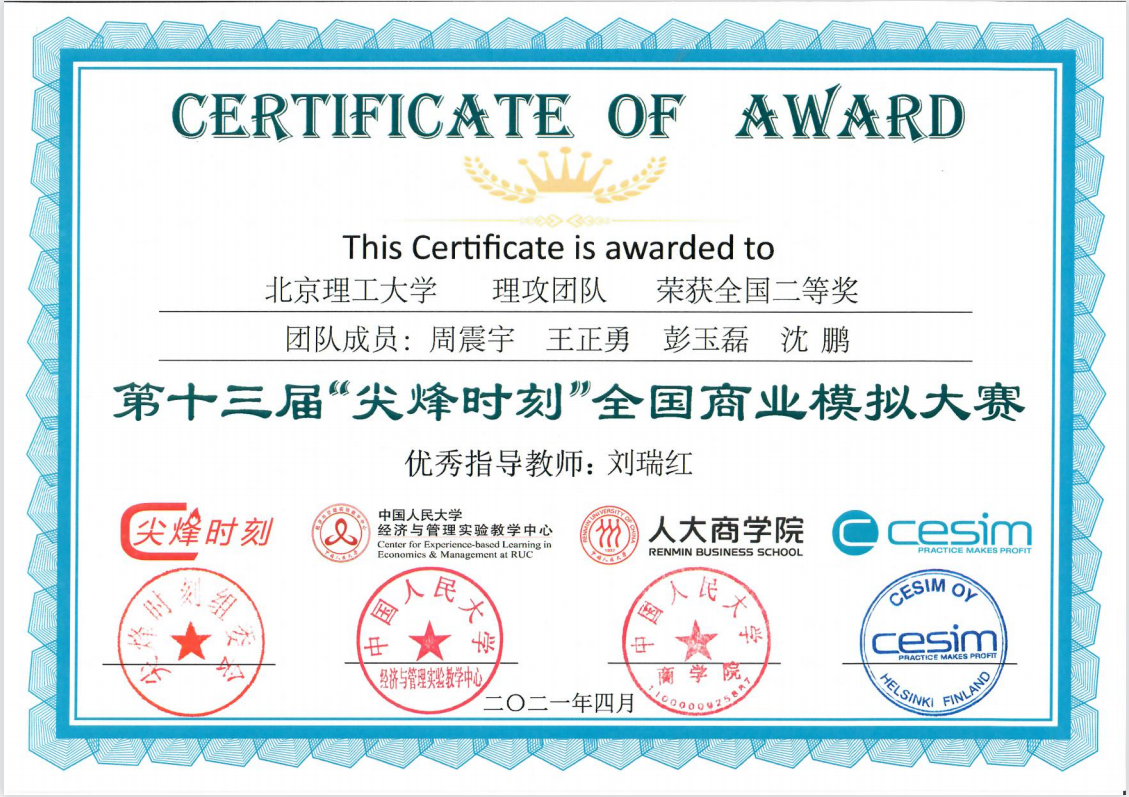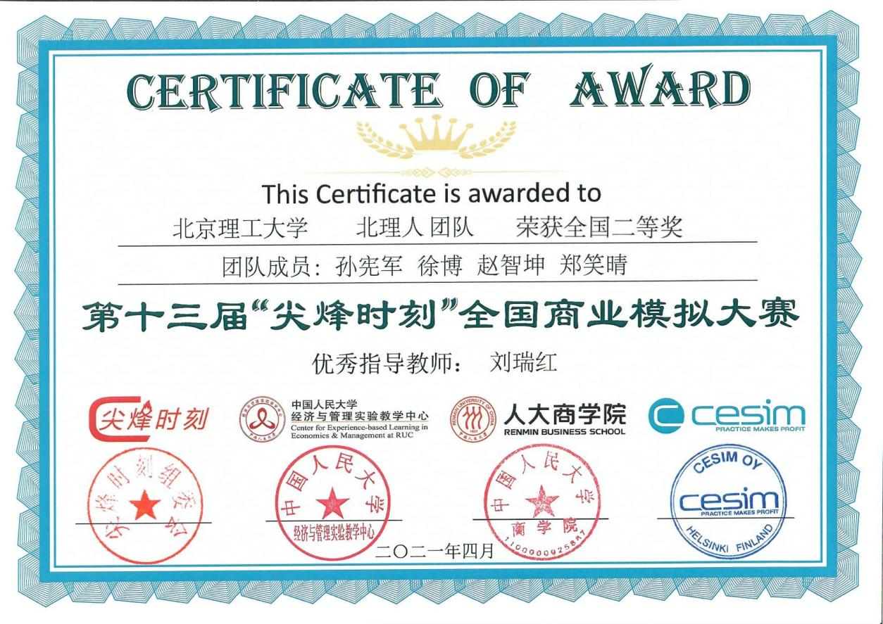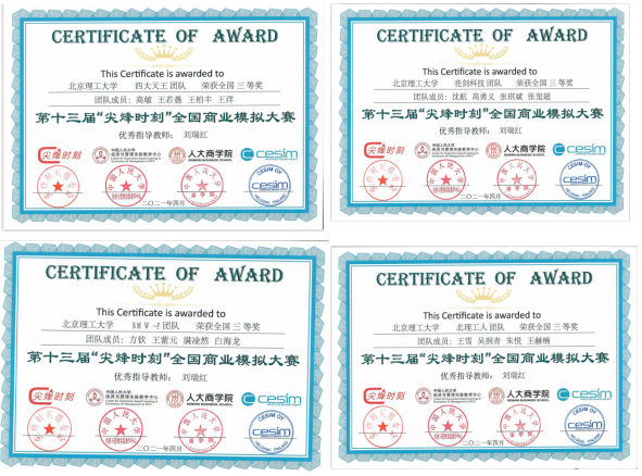 第十三届“尖烽时刻”全国商业模拟大赛历时7个月,一共有1400余支队伍参赛,其中MBA/研究生组别初赛队伍600余支(不含省赛、校内赛数量),复赛293支队伍。最终全国知名高校的29支本科队伍、42支MBA队伍出征总决赛。我校三支MBA队伍“理攻”、“天宇晨岚”、“北理人”经过激烈的角逐,脱颖而出,荣获全国总决赛二等奖的好成绩。“北理工人团队”、“亮剑科技团队”、“四大天王团队”、“BMW-F团队”四支团队荣获三等奖。大赛指导教师由我院经验丰富的市场营销系刘瑞红担任,在刘老师的精心指导下,同学们斩获佳绩。同时也祝贺第十三届“尖烽时刻”全国商业模拟大赛圆满成功。