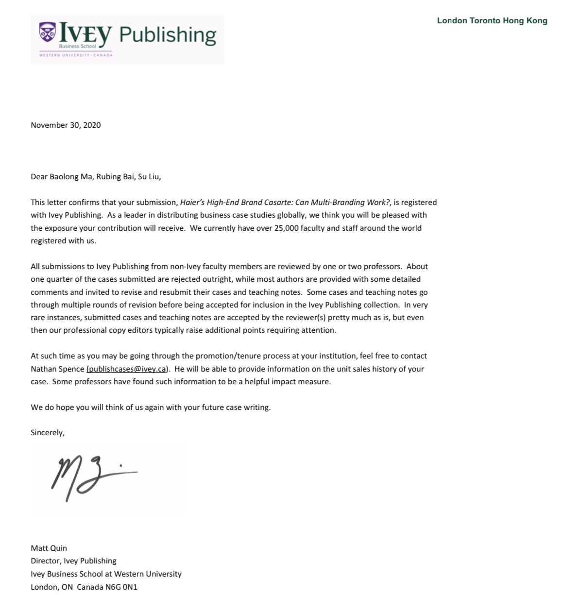 11月30日,由我校管理与经济学院马宝龙教授及其博士生白如冰等人开发撰写的教学案例《Haier’s High-End Brand Casarte: Can Multi-Branding Work?》(案例编号:9B20M203)正式被毅伟案例库(Ivey Publishing)收录并出版。该案例描述了海尔集团发展高端子品牌卡萨帝的战略路径和决策过程。这是我校首篇被加拿大毅伟案例库收录并出版的教学案例,意味着我院教学案例入选世界顶尖商学院案例库的一个突破。