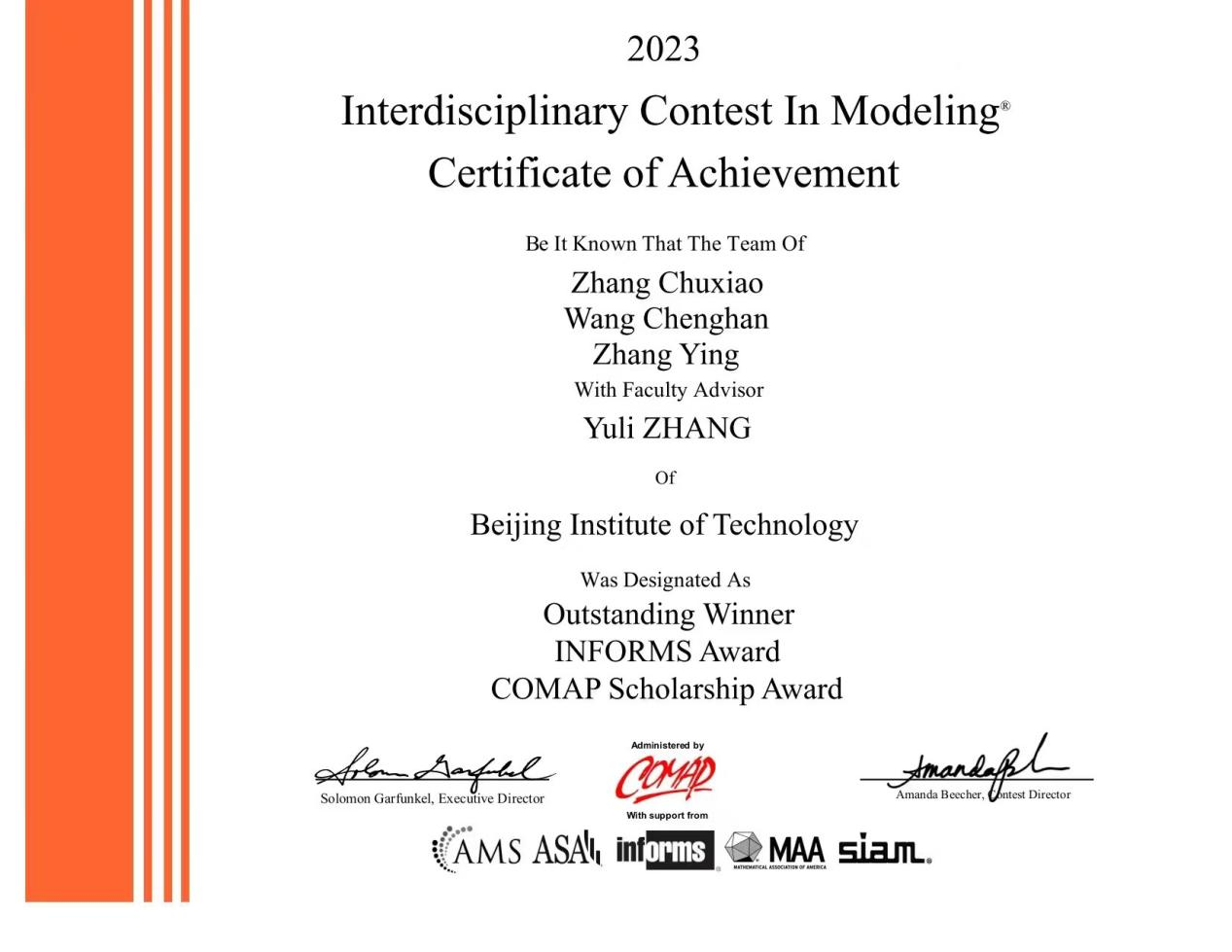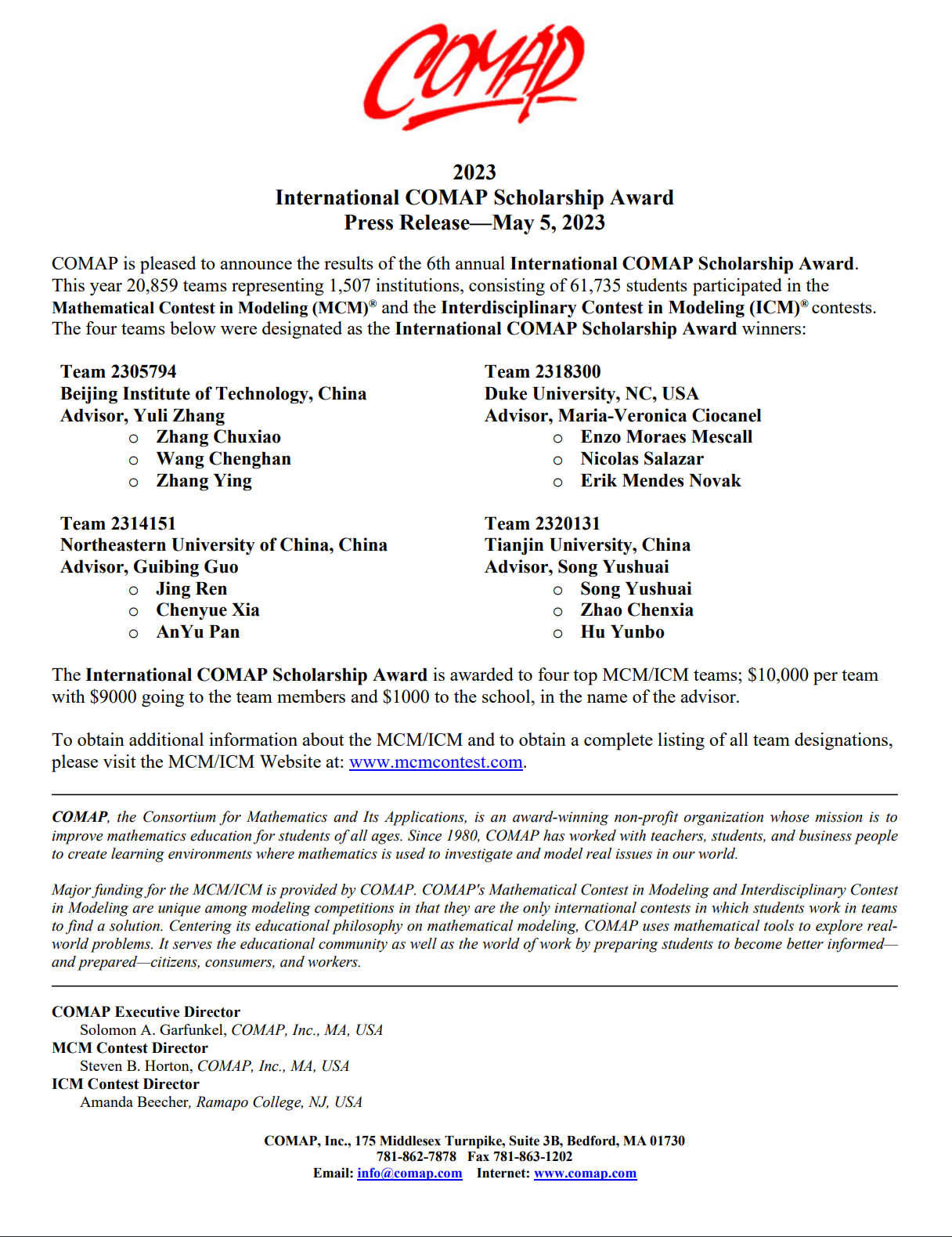 近日,2023年美国大学生数学建模与交叉学科建模竞赛(MCM&ICM)结果公布。由管理与经济学院张玉利长聘副教授指导的数学建模团队——2019级本科生张迎(管理与经济学院)、2020级本科生王成翰(管理与经济学院)和张储骁(特立书院)在全球超过2万多支队伍中脱颖而出,获得该赛事的最高奖项——Outstanding Winners(特等奖)。基于该团队在数学建模方面的突出表现,该团队被数学及其应用联合会(Consortium for Mathematics and Its Applications) 授予International COMAP Scholarship Award(本年度全球仅四支队伍获此奖励,每支获奖队伍将获得COMAP奖学金1万美元),同时该团队获得了美国运筹与管理学会授予的单项冠名奖INFORMS Award(每个赛题仅授予一个队伍,表彰其在建模和分析方面的创新)。这是我院教师指导的学生团队首次获得美赛特等奖,也是我校首次获得International COMAP Scholarship Award,刷新最高获奖记录。